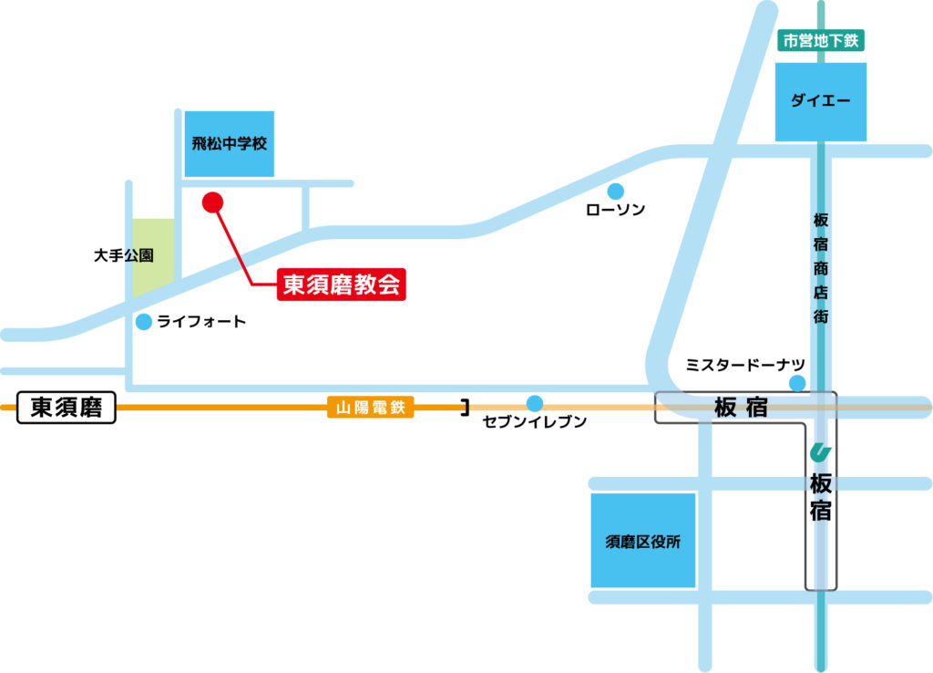 教会のお隣は神戸市立飛松中学校です。道に迷われた時は、お気軽にお電話ください。